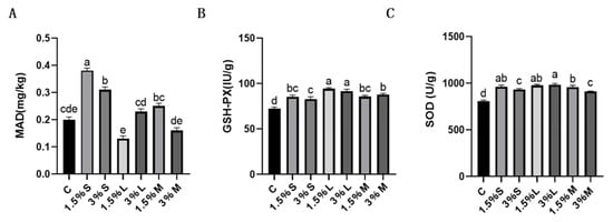 Each value is presented as mean ± SD, different superscript (a–e) indicates significant differences (p < 0.05). The effect of different oils on MDA, SOD, and GPX in egg yolk. C: control group; 1.5% S or 3%: addition of 1.5% or 3% of soybean oil to the base diet, respectively; 1.5% L or 3%: addition of 1.5% or 3% of lard to the base diet, respectively; 1.5% or 3% M: addition of 1.5% or 3% of mixed oils to the base diet, respectively. (A): effect of different oils and fats on MDA in raw egg yolk; (B): effect of different oils and fats on GSH-PX in raw egg yolk; (C): effect of different oils and fats on SOD in raw egg yolk.