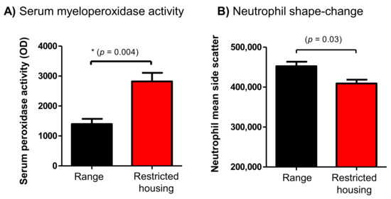 Analysis of serum myeloperoxidase activity and neutrophil shape-change. (A) Serum samples were collected from the camels before and after restricted housing and analyzed for myeloperoxidase activity using a colorimetric assay. Optical density (OD) values are presented for free-range and restricted-housing animals as mean ± standard error of the mean (SEM). (B) Neutrophil shape-change was analyzed by the assessment of neutrophil side scatter values using flow cytometry. The student’s t-test was used to compare the means, and the * p-value is indicated on the graph.