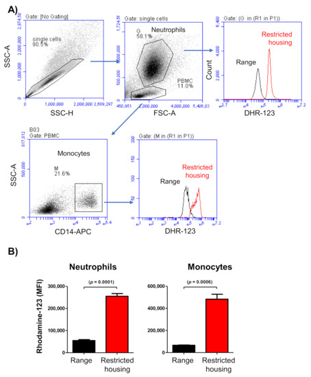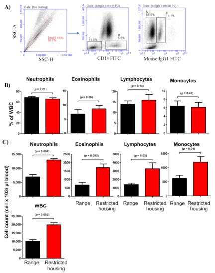 3.7. The Phagocytic Activity of Monocytes and Neutrophils Was Reduced after Restricted Housing
