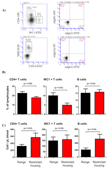 While the fractions of B cells did not differ between housed and range animals (p = 0.42), and the fraction of CD4-positive T helper cells was only slightly (p = 0.09) reduced in the blood from housed camels, the percentage of γδ T cells was significantly (p = 0.03) lower in the blood from housed camels (Figure 4A,B). In contrast to their relative fractions, the absolute numbers of B cells (p = 0.04) and helper T cells (p = 0.03) were significantly increased in the blood from housed animals (Figure 4C).
