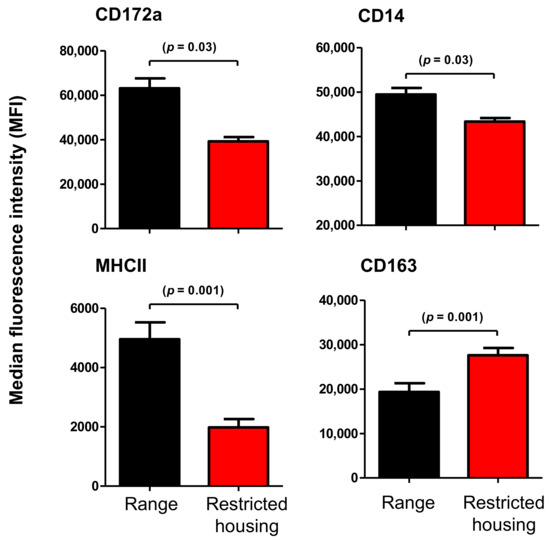 Monocytes from housed camels showed a significantly different phenotype in comparison to free-range animals (Figure 5). The median fluorescence intensity (MFI) values of CD172a (p = 0.03), CD14 (p = 0.03) and major histocompatibility complex (MHC) class II molecules (p = 0.001) were lower for monocytes collected from housed camels when compared with those from free-range animals. In contrast to this, the scavenger receptor CD163 was upregulated (p = 0.001) on monocytes from housed camels in comparison to those from free-range camels (Figure 5).