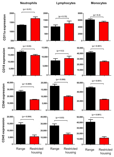 Restricted animal housing resulted in marked decreases in the abundance of the cell adhesion molecules CD44 and CD45 on all leukocyte populations, including granulocytes, monocytes, and lymphocytes (Figure 6). The average CD44 downregulation was 47.9% (compared to MFI values in free-range animals) for monocytes (p = 0.001), 57.9% for granulocytes (p = 0.006), and 58.6% for lymphocytes (p = 0.009). (Figure 6). Similarly, CD45 was downregulated on granulocytes (38.3% of MFI values in free-range animals; p = 0.004), monocytes (28.2%; p = 0.001), and lymphocytes (56%; p = 0.03) from housed animals in comparison to free-range animals. In addition, housed animals showed increased abundance of CD11a on granulocytes but decreased CD18 expression on monocytes and granulocytes when compared to free-range animals (Figure 6).