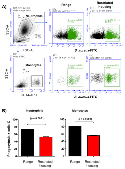 Flow cytometric evaluation of the capacity of monocytes and neutrophils to uptake staphylococcus aureus bacteria revealed a negative effect of restricted housing on the phagocytosis of myeloid cells in camels (Figure 7A,B). In housed animals, the percentages of neutrophils (52.51 ± 1.2% of total cells) and monocytes (55.83 ± 1.1) with ingested bacteria were significantly reduced in comparison to their percentages in free-range animals (73.35 ± 2.1% for neutrophils and 80.48 ± 1.7% for monocytes) (Figure 7A,B).