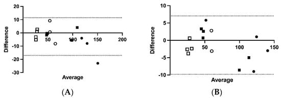 Bland–Altman plots showing the difference in ACTH concentrations (pg/mL) in samples kept at: (A) 4 °C versus 20 °C; (B) 4 °C versus 30 °C; (C) 4 °C versus 40 °C; and (D) 4 °C versus 70 °C in 15 horses. The solid lines represent the mean differences and the dotted lines represent the 95% level of agreement. Squares represent horses in which the basal ACTH concentration was determined and circles indicate horses in which the post-TRH stimulation ACTH concentration was determined. Hollow shapes represent non-PPID horses and solid shapes indicate horses with PPID.