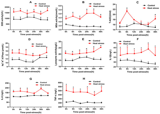 Physiological and biochemical indices of rainbow trout under acute heat stress. (A–D) represent the levels of antioxidant factors SOD, MDA, T-AOC, and Na+-K+-ATPase in the serum of rainbow trout under 22.5 °C for 48 h (n = 6, *, p < 0.05). (E–H) represent the levels of inflammatory cytokines lysozyme, IL-1β, IL-6, and TNF-α in the serum of rainbow trout under 22.5 °C for 48 h (n = 6, *, p < 0.05).