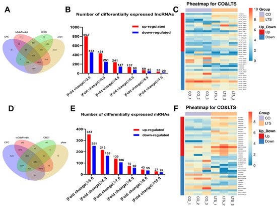 The expression profiling changes of lncRNAs and mRNAs in the head kidney of rainbow trout after post-22.5 °C stress. (A) Coding ability predicts outcomes of lncRNAs. (B) The statistical results of the number of lncRNAs. (C) The heat maps of the top 20 lncRNAs differential genes up-regulated and down-regulated, respectively. (D) Coding ability predicts outcomes of mRNAs. (E) The statistical results of the number of mRNAs. (F) The heat maps of the top 20 mRNAs differential genes up-regulated and down-regulated, respectively.