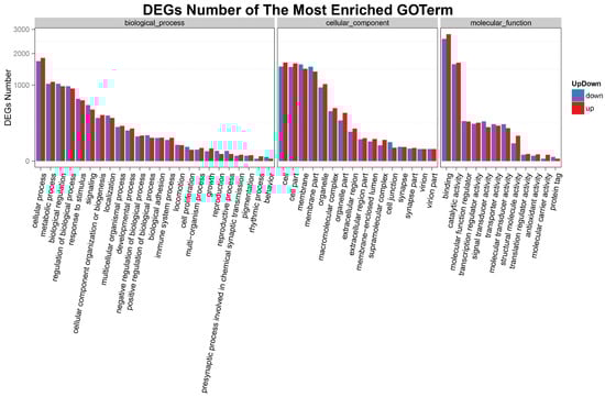GO analysis of DEGs in the head kidney of rainbow trout after post-22.5 °C stress. The X-axis represents the GO functional classification, and the Y-axis represents the number of up-regulated or down-regulated genes corresponding to GO term; the red is the number of up-regulated genes, and blue is the number of down-regulated genes.
