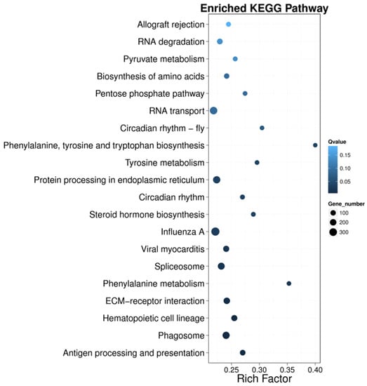 Pathway enrichment analysis is a method to classify and analyze multiple genes with a certain biological function according to the form of signaling pathway. In the current study, the top 20 pathways of KEGG enrichment of DEGs in rainbow trout under acute heat stress were presented in the form of scatter plots (Figure 4). The DE lncRNAs in the head kidney of rainbow trout were significantly enriched in the following signaling pathways: allograft rejection, RNA degradation, pyruvate metabolism, biosynthesis of amino acids, the pentose phosphate pathway, RNA transport, circadian rhythm-fly, phenylalanine, tyrosine and tryptophan biosynthesis, tyrosine metabolism, protein processing in the endoplasmic reticulum (ER), circadian rhythm, steroid hormone biosynthesis, influenza A, viral myocarditis, spliceosome, phenylalanine metabolism, ECM-receptor interaction, hematopoietic cell lineage, phagosome, and antigen processing and presentation. These results were similar to enriched pathways, which were analyzed with predicted genes in the heat stress regulation of rainbow trout.