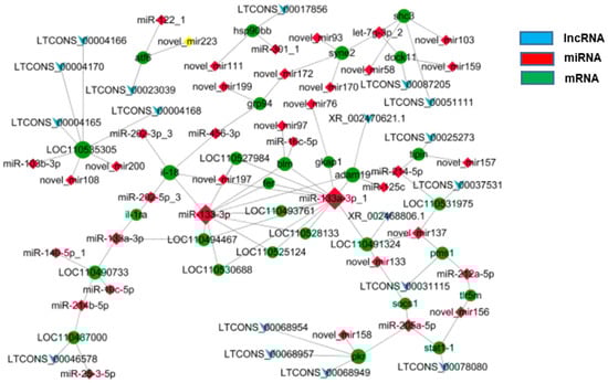In line with previous miRNA sequencing data [1], the lncRNA-miRNA-mRNA regulatory network was constructed to conduct interaction association analysis on the major DEGs involved in regulating heat stress in rainbow trout. The results showed that there were 18 lncRNAs, 38 miRNAs, and 29 mRNAs DEGs co-expressed, among which there were 88 miRNA-mRNA interaction pairs and 18 lncRNA-mRNA interaction pairs (Figure 5).