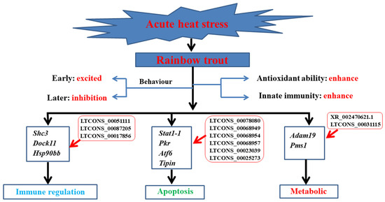 Conclusively, the present study provides a systematic description of the changes in lncRNAs and mRNAs in rainbow trout under acute heat stress conditions. Within 48 h of acute heat stress, oxidative damage was observed in rainbow trout at the physiological level due to lipid metabolism disorders and the excessive release of pro-inflammatory cytokines. At the transcriptome level, the DEGs lncRNAs and miRNAs competitively bind to mRNAs. The target genes are mainly involved in physiological functions such as immune regulation, apoptosis, and metabolic processes in rainbow trout. Furthermore, the data obtained represent a resource for further investigations of the function of some of these ncRNAs, as it could provide the basic information required to elucidate the mechanisms associated with regulating acute heat stress in rainbow trout at the molecular level.