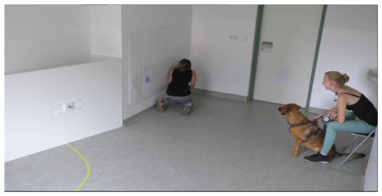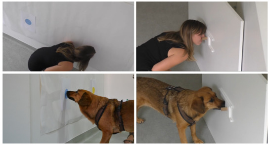 At the beginning of an overimitation test trial, the experimenter brought the dog to the observer position. The dog was on a short leash and the experimenter was sitting behind it on a chair, with the human caregiver standing to the left. As soon as the dog sat calmly, the caregiver fed the dog a treat to gain its attention to then start the demonstration. The demonstrator attempted to show the two actions in a dog-like manner by using the same body parts that the dog would use. Therefore, the caregiver got down on hands and knees to touch the dots and open the sliding door with his/her nose (Figure 2). In contrast to Huber et al. [19], we did not divide the subjects into four different groups and only demonstrated the classical overimitation sequence in which the irrelevant action is followed by the relevant action [20,24]. The causally irrelevant action included touching the two coloured dots, first the blue then the yellow, with the nose. Next, the caregiver went to the white, wooden wall and demonstrated the relevant action. The demonstrator got down on hands and knees again and pushed the handle of the sliding door with their nose, to the left. The treat was taken out with the hand, shown to the dog and then, after turning around again, was placed back into the food box (covered by the demonstrator’s body and out of the dog’s view). Immediately after the demonstrator returned to the starting position, the dog was released by the experimenter. The dog was allowed to explore the room freely for two minutes and possibly copy the demonstrated actions.