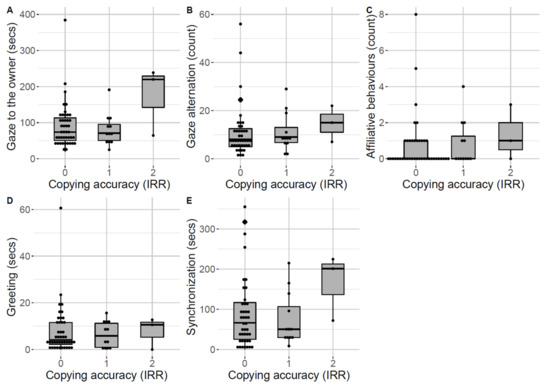 Owner-directed behaviours during the relationship test across dogs showing the different levels of copying accuracy of the irrelevant action (IRR) during the overimitation test: (A) Gaze to the owner; (B) Gaze alternation; (C) Affiliative behaviours; (D) Greeting; (E) Synchronization. Median and interquartile range (IQR; represented by the box), 25th percentile + 1.5 IQR, and 75th − 1.5 IQR (represented by the lower and the upper whiskers, respectively). Dots represent outliers.