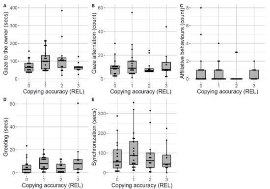 Owner-directed behaviours during the relationship test across dogs showing the different levels of copying accuracy of the relevant action (REL) during the overimitation test: (A) Gaze to the owner; (B) Gaze alternation; (C) Affiliative behaviours; (D) Greeting; (E) Synchronization. Median and interquartile range (IQR; represented by the box), 25th percentile + 1.5 IQR, and 75th − 1.5 IQR (represented by the lower and the upper whiskers, respectively). Dots represent outliers.