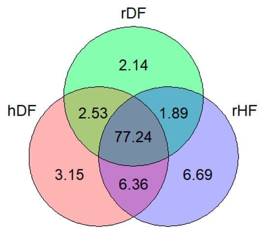 Among the set of 10,780,681 SNPs, 11.98% were identified as putatively group-specific (Figure 1), indicating that the genotype of one of the alleles was present in only one of the three groups (hDF, rDF, and rHF). SNPs specific for rHF were the most abundant (6.69%), while rDF displayed the lowest number of group-specific SNPs (2.14%). It is notable that the percentage of group-specific SNPs for the DF (hDF and rDF) groups was 7.82%, which is slightly higher as for rHF (6.69%). Over 77% of the SNPs occurred in all three groups.