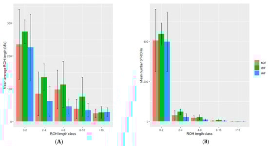 The number and length of ROHs differed among animals and across groups (Table 4). The rDF group had the highest number of ROHs (513), whilst rHF had the lowest number (424). Additionally, rDF had the highest average length of ROHs (1.19 Mb) and rHF the lowest (0.73 Mb). Variation existed in the distribution of the various ROH length classes, but a common pattern was observed across the groups (Figure 3, Figure S1). The majority of ROH segments (~85 to 95%) is found in the length class 0 to 2 Mb for all three groups. The number of ROHs was the highest for rDF and the lowest for rHF in all classes, except class >16 Mb. The range of number of ROHs was more variable in the hDF and rHF groups in comparison with a more even number of ROHs for rDF group.