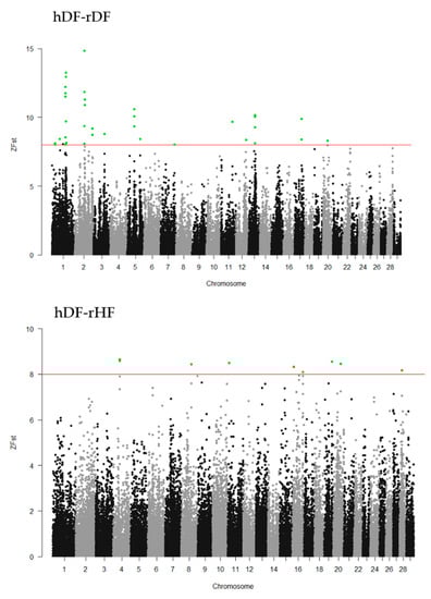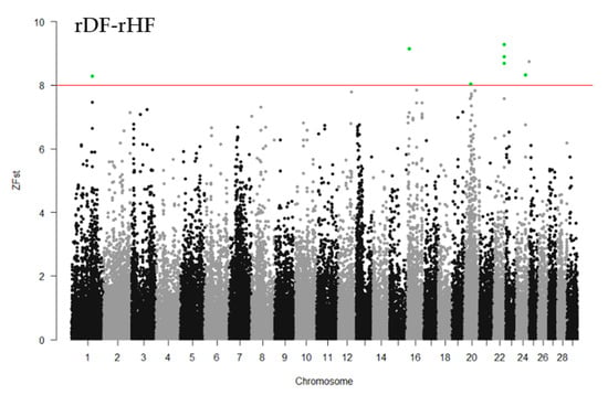 The fixation index (Fst) was used to characterize the differentiation between the groups, i.e., to identify selection signatures. The pairwise estimates of Fst among the three groups (hDF-rDF, hDF-rHF, and rDF-rHF) were calculated using VCFtools with the Weir and Cockerham approach (--weir-fst-pop) [25]. Windows of SNPs were used to minimize the stochastic effect of a single SNP. The Fst values were averaged across 40-kb windows, with a sliding frame of 20 kb at a time. The parameters for the VCFtools program were “—fst-window-size 40,000--fst-window-step 20,000”, following Rafiepour et al. [26]. To normalize the mean Fst values, Z-transformation was performed , where Fst is mean Fst in a window, µFst is an average Fst over all windows, and αFst is a standard deviation of Fst values of all windows tested for a given comparison [27]. The ZFst was visualized in the form of a Manhattan plot by the R package ‘qqman’ (version 0.1.8) [28]. Candidate genomic regions under selection were defined as regions where the ZFst value > 8. To reduce the number of false positives, windows with less than 5 SNPs were removed.