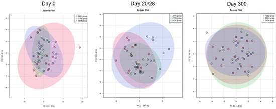 Principal coordinate analysis of serum metabolites on day 0 (before antibiotic administration), day 20/28 (last day of antibiotic treatment for the AMC and DOX groups, respectively), and day 300 for cats in the AMC, CON, and DOX groups.