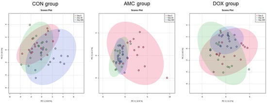 Principal coordinate analysis of serum metabolites for CON, AMC, and DOX groups on days 0, 20/28, and 300.