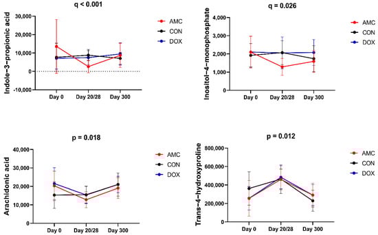 Table 3 shows the complete list of serum metabolites for which the abundance changed within the first year of life in cats treated with amoxicillin/clavulanic acid. Amoxicillin/clavulanic acid caused few changes to the serum metabolites of kittens when compared to the other groups of cats. Indole-3-propionic acid (p < 0.001), an antioxidant, and inositol-4-monophosphate (q = 0.026), an inositol lipid derivative, were detected at significantly lower concentrations in AMC cats compared to CON and DOX cats on the last day of treatment (Table 1, Figure 3).