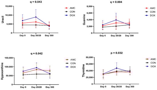 Table 4 contains the complete list of serum metabolites for which the abundance changed within the first year of life in cats treated with doxycycline. The concentrations of serum metabolites in 2-month-old cats were characterized by significant changes after 28 days of treatment with doxycycline, i.e., from 2 to 3 months of age. Concentrations of pyrimidines, including uracil (q = 0.043), and purines, including guanine (q = 0.004) and hypoxanthine (q = 0.042), were at significantly higher levels in DOX cats compared to CON cats on the last day of treatment (Table 1, Figure 4).