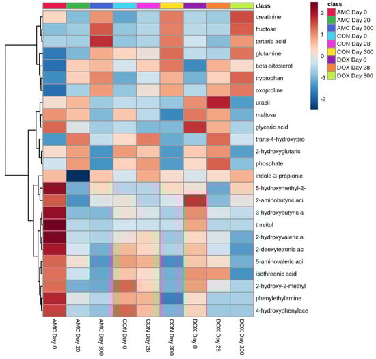 Heatmap clustering metabolites in serum of AMC, CON, and DOX cats over time (days 0, 20/28, 300). For simplicity, the figure only displays the average intensities of the top 25 metabolites that were different (q < 0.05) based on the ANOVA. The higher the signal intensity of a metabolite, the more intensely red the metabolite shows. The lower the signal intensity of a metabolite, the more intensely blue the metabolite shows in the heat map. Each row corresponds to a single metabolite. Each column represents the average intensity of a metabolite at a given sampling time within AMC, CON, and DOX groups, and samples are grouped by day within each treatment group along the x-axis.