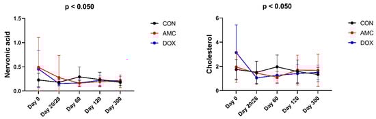 The AMC and DOX cats had no significant differences in fecal BA concentrations compared to CON cats at any time point. There was only a tendency for decreased concentrations of secondary BAs in both antibiotic-treated groups on the last day of treatment compared to CON cats, but this did not reach statistical significance (p = 0.090). However, concentrations of fatty acids and sterols were significantly affected by antibiotics. Nervonic acid and cholesterol were detected at significantly lower concentrations in DOX cats compared to CON cats on the last day of treatment (nervonic acid, p = 0.010; cholesterol, p = 0.005) as well as 1 month (i.e., day 60) (nervonic acid, p < 0.001; cholesterol, p = 0.001) and 3 months (i.e., day 120) (nervonic acid, p = 0.037; cholesterol; p = 0.048) after antibiotic withdrawal. Nervonic acid concentrations were also significantly lower in AMC cats at 1 month (p = 0.001) and 3 months (p = 0.032) after antibiotic withdrawal compared to CON cats (Figure 6). A table with the raw metabolites and a table with the mean abundances and standard deviation with the metabolites identified in fecal samples are available as Table S3 and Table S4, respectively.