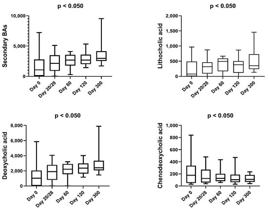 Table 5 shows the complete list of fecal metabolites for which the abundances changed significantly within the first year of life in CON cats, presented as mean values with standard deviations. Within the CON cats, total secondary BAs (p = 0.003) as well as some individual secondary BAs (LA, p = 0.038; DCA, p < 0.050) increased, while some individual primary BAs (CDCA percentage, p = 0.006) decreased after 2 months of age (i.e., day 0) (Figure 7). The abundance of linoleic acid (p = 0.013), total sterols (p = 0.039), as well as some individual sterols (coprostanol, p = 0.017; campesterol, p = 0.012; stigmasterol, p = 0.001; fusosterol, p = 0.016; beta-sitosterol, p = 0.004; sitostanol, p < 0.001) significantly increased.