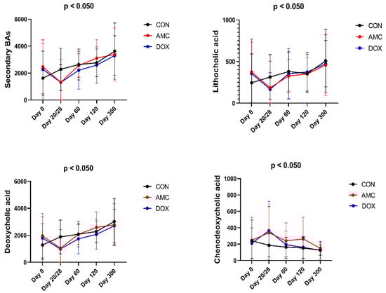 Fecal concentrations of total (p < 0.001) and individual secondary BAs (LA, p = 0.004; DCA, p = 0.010) increased, while individual primary BAs (CDCA percentage, p = 0.006) decreased after amoxicillin–clavulanic acid discontinuation (after the age of 3 months). In contrast to CON cats, where total secondary BAs increased and total primary BAs (CDCA percentage) decreased from 2 to 3 months of age, the age-related increase in secondary BAs and decrease in primary BAs was delayed by 1 month and started to appear after 3 months of age (Figure 8) in AMC cats. Individual fatty acids significantly decreased during treatment, as well as 1 month after the discontinuation of the antibiotic. Sterols changed over time and showed a similar pattern when compared to the pattern observed in CON cats (Table 6).