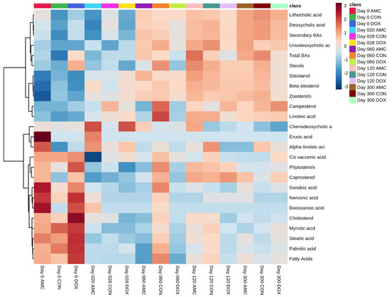 Similar to the AMC-treated cats, the fecal concentrations of total secondary bile acids (p < 0.050) and some individual secondary BAs (LA, p = 0.006; DCA, p < 0.050), as well as some individual primary BAs (CDCA percentage, p = 0.004), started to increase after the end of treatment with doxycycline (Figure 8). Individual fatty acids and sterols significantly decreased during doxycycline treatment (Table 7), which was not observed within the CON cats at this age. Heatmaps, which graphically represent variations in fecal metabolite concentrations within each group of cats, are presented in Figure 9.