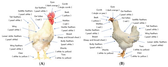 A flock of TSC was created by crossbreeding commercial broiler chickens and Thai native chickens called Kaimook e-san1 (50% native chicken). Mixing between the broiler and KM1 was used to create Kaimook e-san2, named KM2 (25% native chicken), in 2014. To date, KM2 has developed until the 6th generation. For the breeding plan, each cock was mated to five hens (artificial insemination) by within-breed selection in a closed nucleus system, and then fertilized to produce eggs that hatched in sets. Three sets of the same parent pairs were bred, each incubated 1 week apart, followed by two more cycles of mating with alternating hens each round; each round produced three sets of offspring. In each generation, there were approximately 1500–1800 chicks, which were selected at 16 weeks of age to produce 30 cocks and 150 hens (effective population size = 100) (called parent stock) to fertilize the next generation. The selection process was divided into two steps: (1) Selection for the desired morphological characteristics of the breed (Figure 1) and (2) selection for individual production traits (the observations more than 1.5 times the interquartile range below the first quartile of each trait were considered outliers and were not used in this analysis).