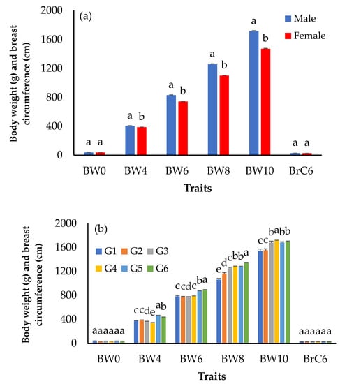 Least-squares means of body weight and breast circumference traits separated by (a) sex and (b) generation in KM2 chickens; a, b, c, d, e: Means for the trait with different letters differ significantly at p < 0.05. BW0—birth weight; BW4—body weight at 4 weeks of age; BW6—body weight at 6 weeks of age; BW8—body weight at 8 weeks of age; BW10—body weight at 10 weeks of age; BrC6—breast circumference at 6 weeks of age; G—generation.