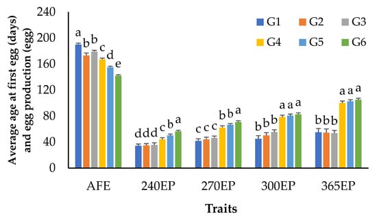 Least-squares means of age at first egg and cumulative egg production traits separated by generation in KM2 chickens; a, b, c, d, e: Means for the same trait with different letters differ significantly at AFE—age at first egg; 240EP—cumulative egg production at 240 days of age; 270EP—cumulative egg production at 270 days of age; 300EP—cumulative egg production at 300 days of age; 365EP—cumulative egg production at 365 days of age; G1-G6—1st generation to 6th generation of chicken.