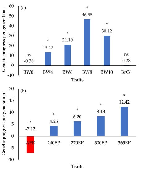 Genetic progress per generation for (a) body weight and breast circumference and (b) age at first egg and cumulative egg production traits in KM2 chickens. ns is not significant difference (p > 0.05); * is significant value within trait by generation (p < 0.05). BW0—birth weight (g); BW4—body weight at 4 weeks of age (g); BW6—body weight at 6 weeks of age (g); BW8—body weight at 8 weeks of age (g); BW10—body weight at 10 weeks of age (g); BrC6—breast circumference at 6 weeks of age (cm); AFE—age at first egg (day); 240EP—cumulative egg production at 240 days of age (egg); 270EP—cumulative egg production at 270 days of age (egg); 300EP—cumulative egg production at 300 days of age (egg); 365EP—cumulative egg production at 365 days of age (egg); The blue bar represents a positive numbers for the genetic progress for each trait; The red bar represents a positive numbers for the genetic progress for each trait.