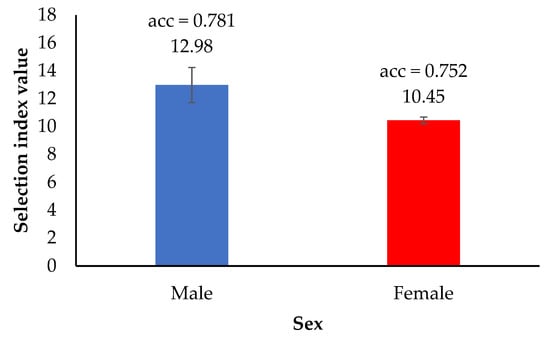 The top 20% of the selection index values in male and female KM2 chickens are shown in Figure 5. The estimated breeding values (EBV) were used in the calculation of the selection index values. The results showed that the top 20% males (12.98) had a higher selection index than the top 20% females (10.45). The accuracy of the selection index was 3.86% greater for the male chickens than for the female chickens.