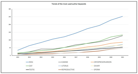 The total number of keywords chosen by authors for this collection was 2536, with dog (n = 327), canine (n = 131), cryopreservation (n = 86), uterus (n = 72), ovary (n = 67), feline (n = 61), testis (n = 54), reproduction (n = 47), sperm (n = 47), and semen (n = 42) being the most reported authors keywords. The trends of the most common author keywords in the decade 2012–2021 are shown in Figure 3. Keyword plus were also retrieved (n = 3268) as they are a WoS tool for capturing the content and scientific concepts presented in articles. In this case, spermatozoa (n = 120), dogs (n = 114), cryopreservation (n = 108), motility (n = 71), semen (n = 57), cat (n = 54), fertility (n = 51), artificial insemination (n = 50), oxidative stress (n = 50), and fertilization (n = 47) were the most frequent.