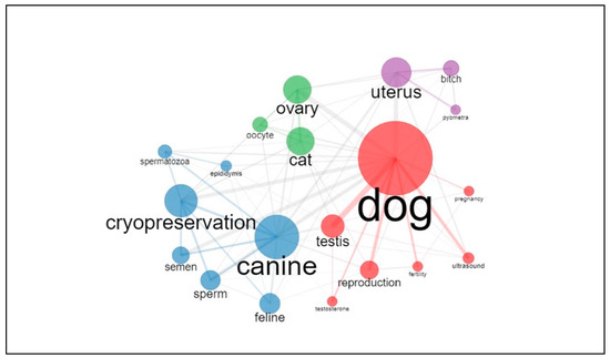 Co-occurrence analysis of the most frequent author keywords in the field of small animal reproduction. Keywords are grouped in four clusters and the thickness of the lines connecting keywords represents the strength of their relationship. The diameter of nodes is proportional to the frequency of each keyword.