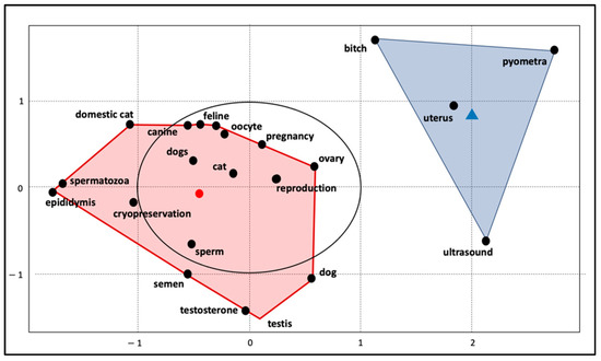 Clustering map (multifactorial analysis) of author keywords in the field of small animal reproduction. The main words are grouped in two clusters. The center of the map (black circle) represents the center of the research field.