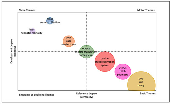 A thematic map was created by using a two-dimensional matrix considering centrality and density as measurements to highlight the most important topics in the field of small animal reproduction. Centrality measures the relevance of a topic, while density estimates the development of a theme. The upper right quadrant is occupied by important and well-developed themes, lower left emerging or declining themes, upper left well-developed themes, and lower right transversal basic themes. The clusters are represented by bubbles within the map, which are labeled by keywords with the highest occurrences, and their size is proportional to the keyword occurrence (Figure 6).