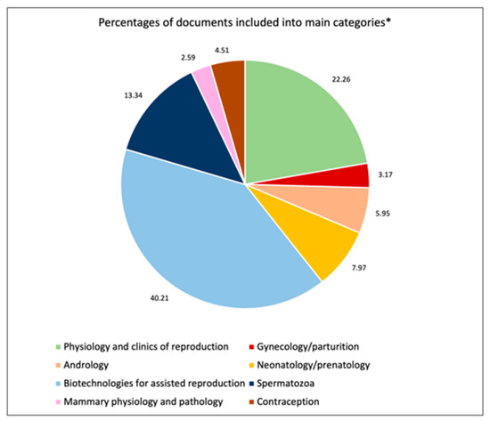 Distribution of documents included in the present study into EVSSAR (European Veterinary Society for Small Animal Reproduction) “selected papers” section (2020). *: “Biotechnologies for assisted reproduction” and “Physiology and clinics of reproduction” are the categories that include the highest percentage of documents.