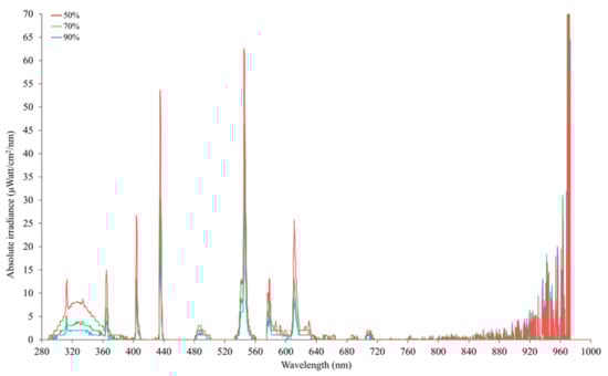 Spectral irradiance under different UV-filtering shade cloths (50%, 70%, and 90% UV block) as measured by an Ocean Insight Flame-S-XR1 Spectroradiometer at a distance of 20 cm with each type of shade cloth placed over a set of three Exo Terra® (Rolf C. Hagen, Montreal, QC, Canada) pet reptile bulbs (Reptile UVB200, 25W, PT2341).
