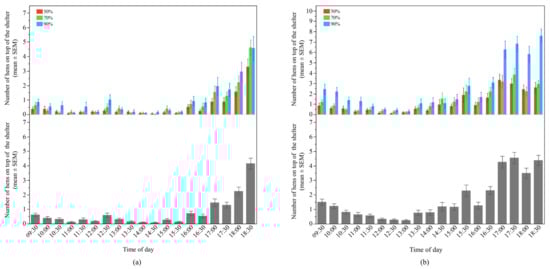 The mean (±SEM) number of hens on top of the shelters throughout the day: (a) Flock-A: with different UV-filtering percentages (50%, 70%, and 90%) (top), on all UV-filtering shelters (bottom); (b) Flock-B: with different UV-filtering percentages (50%, 70%, and 90%) (top), on all UV-filtering shelters (bottom). Note the different Y-axis scales between Flock-A and Flock-B for the top graphs. Raw values are presented with analyses conducted on transformed data.