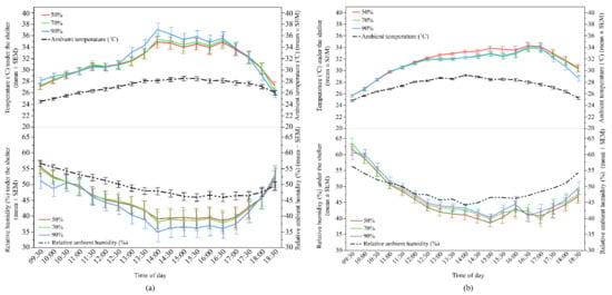 The mean (±SEM) temperature and relative humidity throughout the day underneath the shelters of different UV-filtering percentages (50%, 70%, and 90%) and ambient temperature and relative humidity: (a) Flock-A: temperature under the shelters and ambient temperature (top), relative humidity under the shelters and relative ambient humidity (bottom); (b) Flock-B: temperature under the shelters and ambient temperature (top), relative humidity under the shelters and relative ambient humidity (bottom). Raw values are presented with analyses conducted on transformed data.