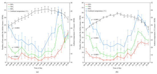 The mean (±SEM) number of hens under the different UV-filtering shelters (50%, 70%, and 90%) and the mean (±SEM) ambient temperature throughout the day: (a) Flock-A; (b) Flock-B (p > 0.10 indicates the variable had no significant effect and was removed from final model). Note the different Y-axis scales between Flock-A and Flock-B. Raw values are presented with analyses conducted on transformed data.