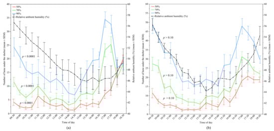 The mean (±SEM) number of hens under the different UV-filtering shelters (50%, 70%, and 90%) and the mean (±SEM) relative ambient humidity throughout the day: (a) Flock-A; (b) Flock-B (p > 0.10 indicates the variable had no significant effect and was removed from final model). Note the different Y-axis scales between Flock-A and Flock-B. Raw values are presented with analyses conducted on transformed data.