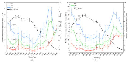 The mean (±SEM) number of hens under the different UV-filtering shelters (50%, 70%, and 90%) and the mean (±SEM) ultraviolet (UVAB) radiation throughout the day: (a) Flock-A; (b) Flock-B (p > 0.10 indicates the variable had no significant effect and was removed from final model). Note the different Y-axis scales between Flock-A and Flock-B. Raw values are presented with analyses conducted on transformed data.