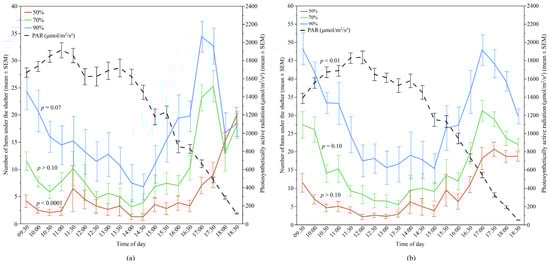 The mean (±SEM) number of hens under the different UV-filtering shelters (50%, 70%, and 90%) and the mean (±SEM) photosynthetically active radiation (PAR) throughout the day: (a) Flock-A; (b) Flock-B (p > 0.10 indicates the variable had no significant effect and was removed from final model). Note the different Y-axis scales between Flock-A and Flock-B. Raw values are presented with analyses conducted on transformed data.