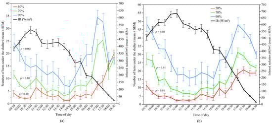 The mean (±SEM) number of hens under the different UV-filtering shelters (50%, 70%, and 90%) and the mean (±SEM) infrared radiation (IR) throughout the day: (a) Flock-A; (b) Flock-B (p > 0.10 indicates the variable had no significant effect and was removed from final model). Note the different Y-axis scales between Flock-A and Flock-B. Raw values are presented with analyses conducted on transformed data.