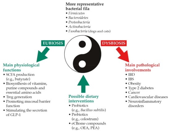 Pathological perturbations of the gut microbial ecosystem balance (the latter known as eubiosis) are defined as dysbiosis [36]. Specifically, dysbiosis can result from the (i) loss of beneficial microorganisms, (ii) excessive growth of potentially harmful organisms, and (iii) reduced overall microbial diversity, with these changes being almost never mutually exclusive [37]. As a result, dysbiosis is able to induce and sustain an inflammatory condition through the predominance of pro-inflammatory microorganisms and the reduction of commensals, promoting immune tolerance mechanisms. The imbalance in the gut microbiota composition has been repeatedly shown to be associated with chronic GI disorders [38,39] and metabolic diseases [40]. In humans, for example, the two main subtypes of human inflammatory bowel disease (IBD), i.e., Crohn’s disease and ulcerative colitis, are associated with dysbiosis characterized by decreased biodiversity and reduced abundance of several types of bacteria belonging to phyla Firmicutes and Bacteroidetes [41]. This is far from the original hypothesis “one-microbe-one-disease”, while supporting the modern view of an imbalance between the entire gut microbiota and the host as the foundation of several GI (and extra-GI) disorders [37] (Figure 1, right side).