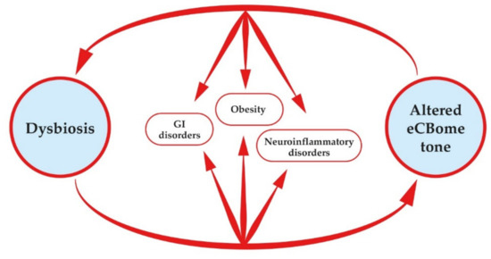 Currently, it is becoming clear that the eCBome and gut microbiota mutually affect each other [1,117,140]. Several lines of evidence are recently suggesting that the altered eCBome tone featuring obesity and diabetes is correlated with gut dysbiosis [127]. Likewise, eCBome is increasingly being considered an important link between the gut microbiome and certain neuroinflammatory disorders [160]. A summary overview is given in Figure 2 and the available evidence is summarized below.