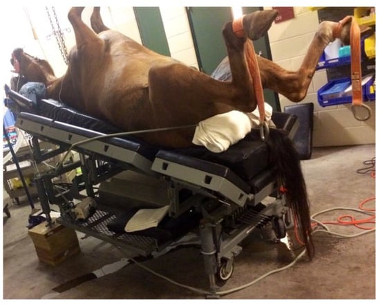 Isoflurane-anesthetized horse positioned in 15° reverse Trendelenburg. To prevent the possibility of horses sliding off the table, a rope padded with towels was placed around the horse’s hindquarters, approximately at the level of the ischiatic tuberosity, with each end secured to the head of the table.